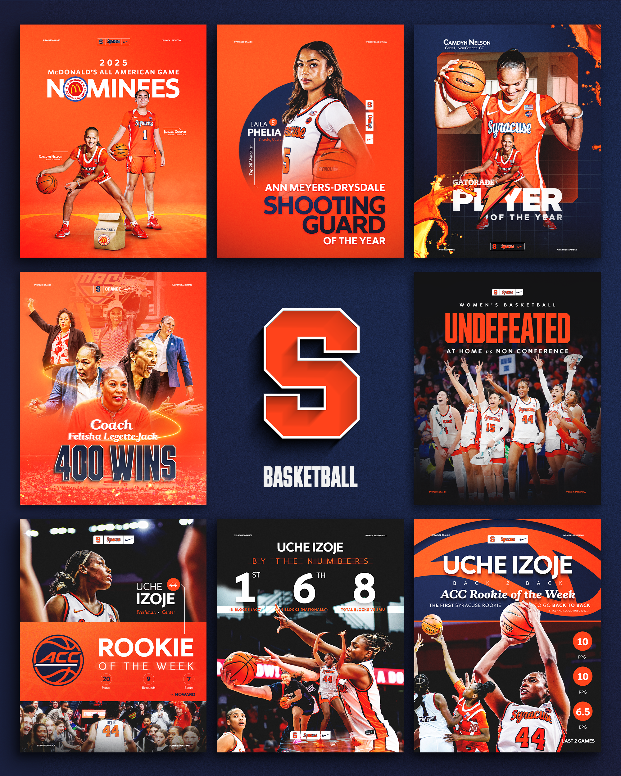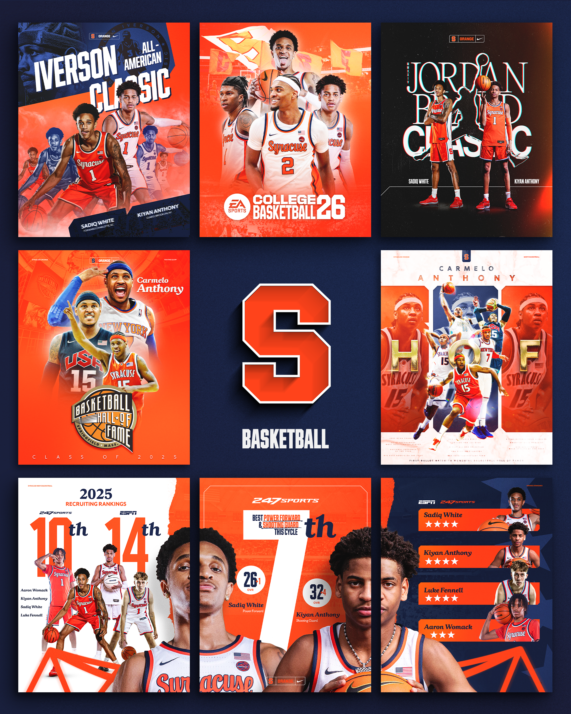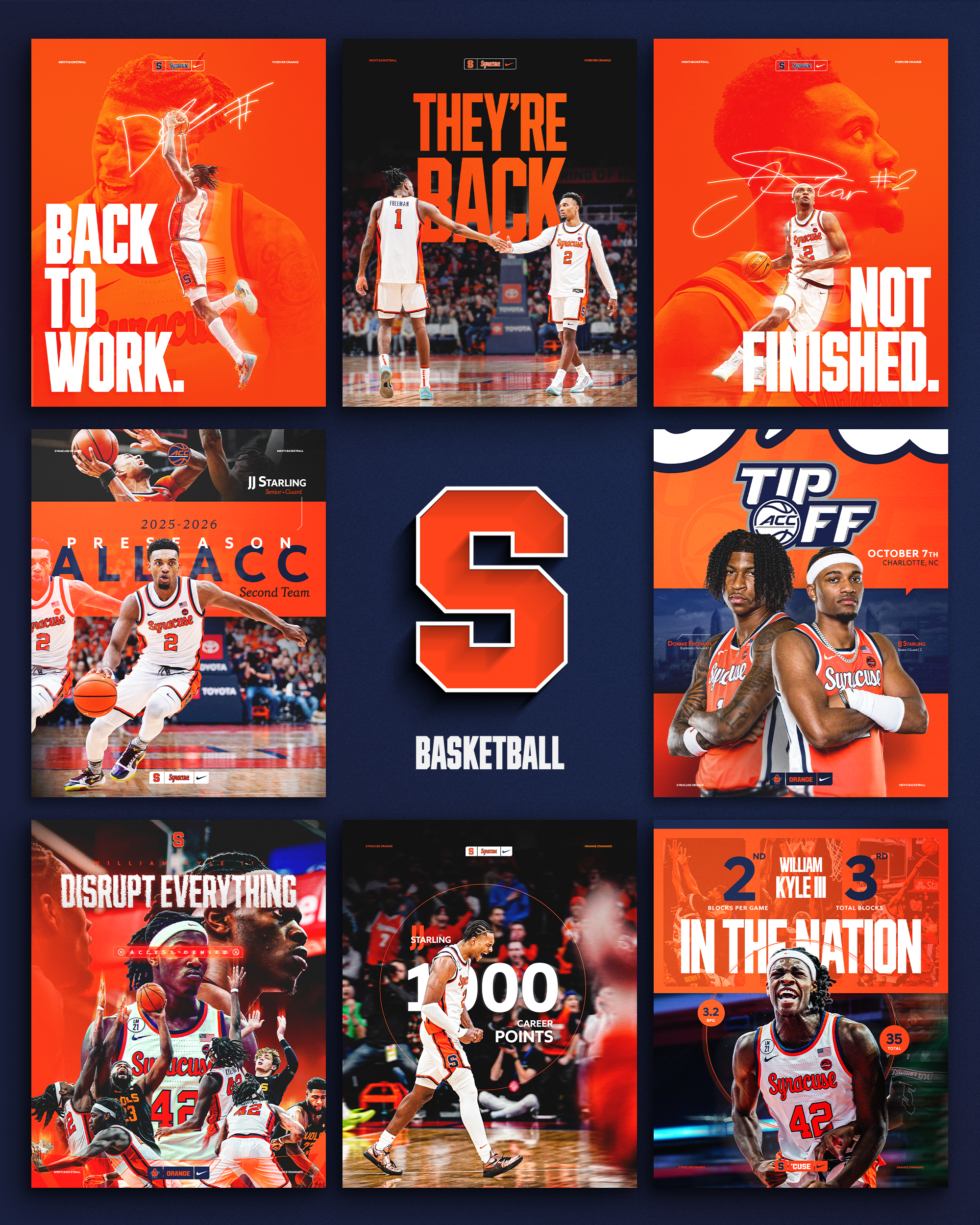 As lead designer for Syracuse Basketball, I was tasked to communicate the new identity for 25–26 through the "Orange Standard": a design system centered on toughness, effort, energy, and grit.